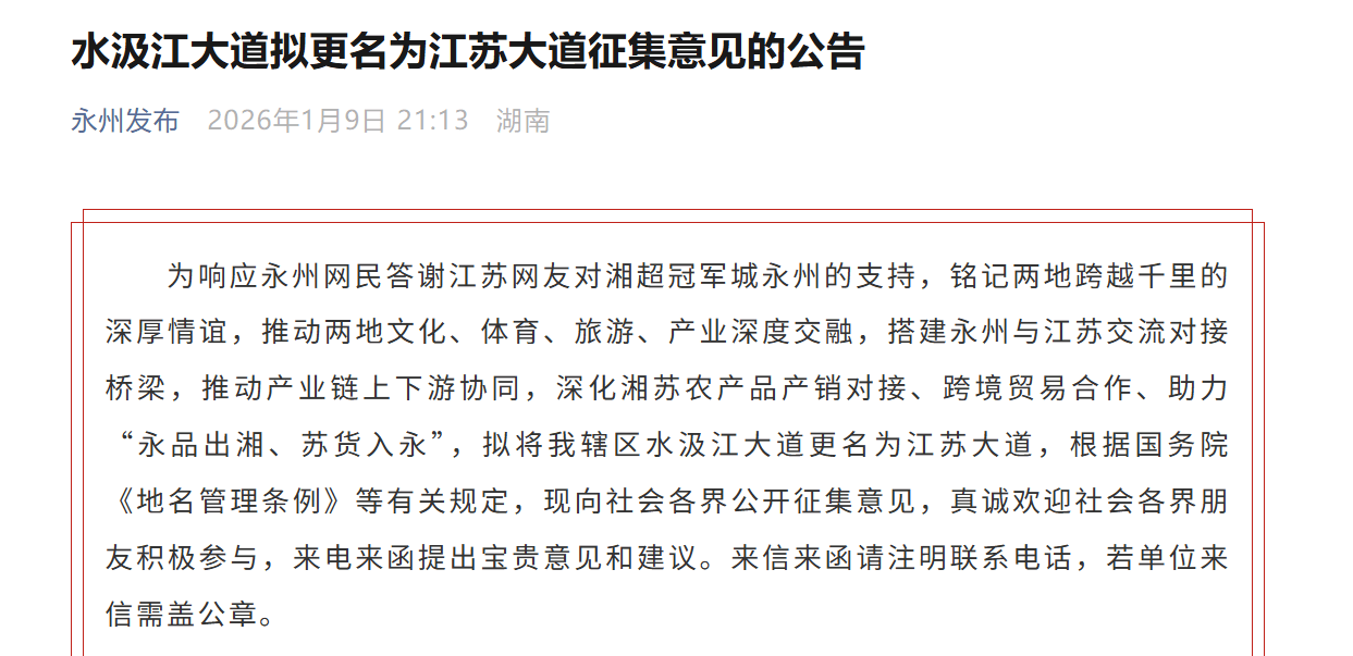 这已不仅是“礼尚往来”。就在我从道县返程的途中,“永州发布”推送《水汲江大道拟更名为江苏大道征集意见的公告》。此举更是将苏永情谊铭刻在了城市发展的蓝图上。体育的纽带,牵引出了文旅的互访、特产的流通,甚至未来产业合作的遐想。它无意中打通了一条从“情感共鸣”到“经济互动”的链条,完美诠释了何为“始于足球,不止于足球”。