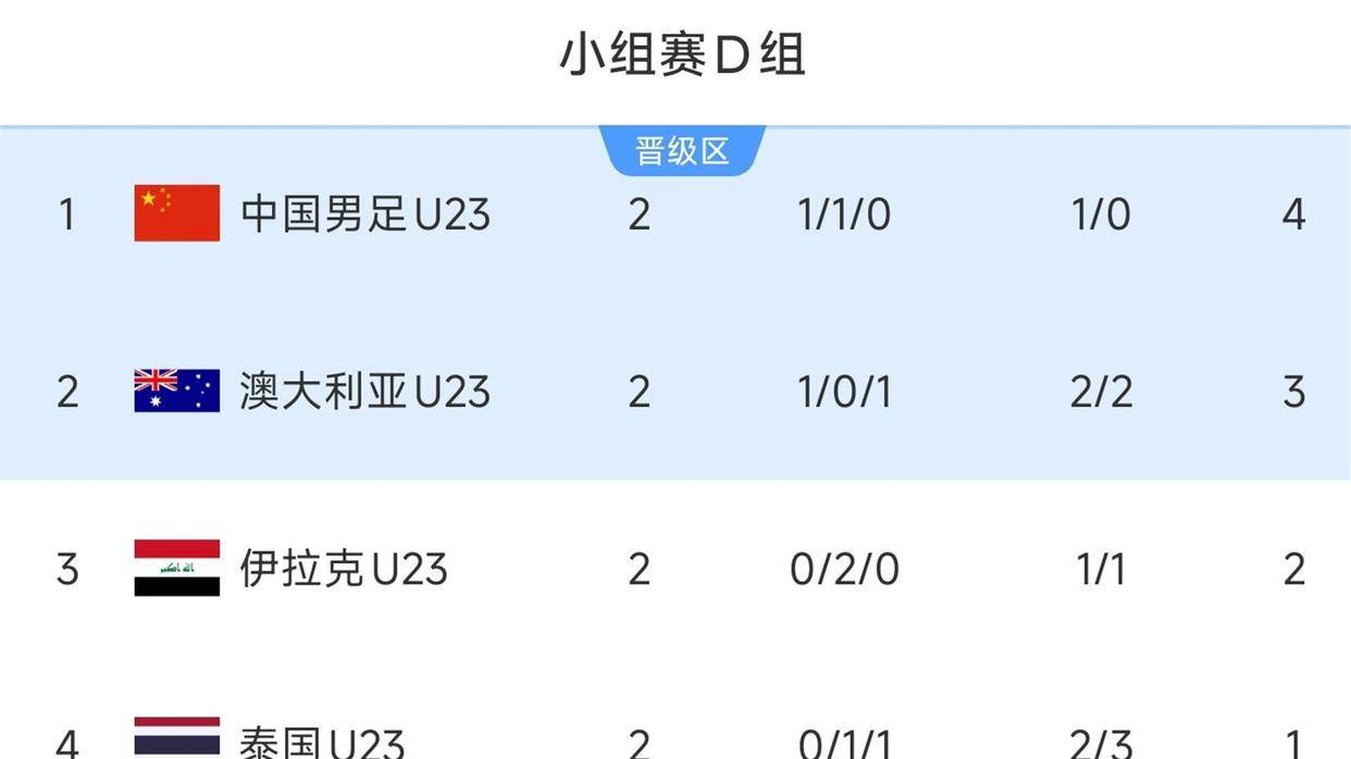 目前D组积分榜上,中国队1胜1平积4分排在榜首。 澳大利亚同样4分但因净胜球劣势排名第二。 泰国队和伊拉克队分别只有1分和0分。 末轮中国队对阵泰国,澳大利亚对阵伊拉克。 根据规则,只要我们战平泰国,积分将达到5分,无论另一场结果如何,都至少能以小组第二的身份出线。