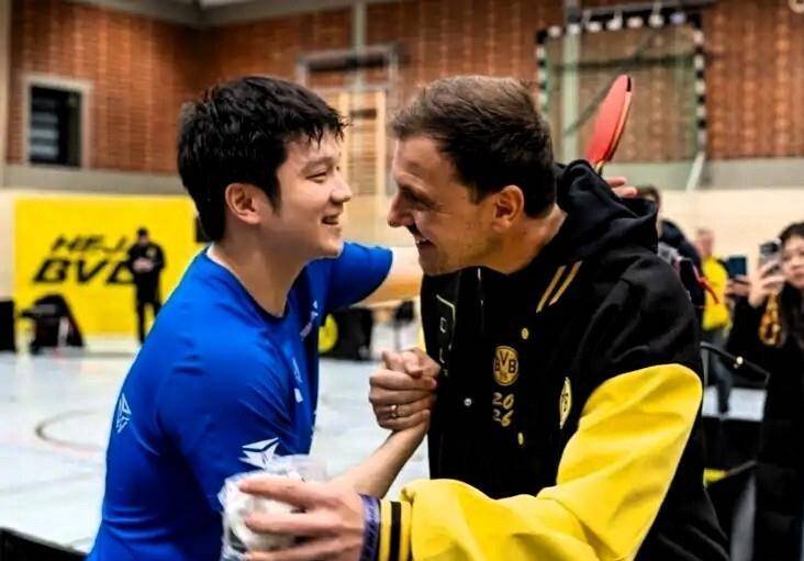 德甲赛场的氛围是另一个“杀手锏”。 观众席离球台近到几乎触手可及,球迷的呐喊声能直接“砸”进运动员的耳朵里。 虽然樊振东也曾委婉提出距离是否太近,但这种近乎“零距离”的观赛体验,恰恰是乒乓球原始魅力的体现。它不冰冷,它充满人情味。樊振东输球后,全场球迷高呼他的名字为他加油;他赢球后,现场会播放他喜欢的粤语歌。 这种情感连接,是任何精心设计的电视转播特效都无法替代的。 在德甲,你能看到两队教练赛前亲热聊天,因为他们曾是队友;你能看到老将波尔像个粉丝一样跑过来拥抱获胜的樊振东,眼神里满是欣赏。 这里,“比赛第二,友谊第一”不完全是句空话。
