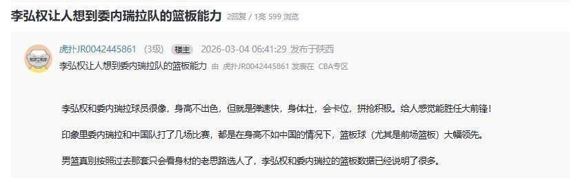 球迷们在赛后论坛上的讨论异常热烈。 很多人把李弘权和以拼抢凶狠、作风顽强著称的南美球队委内瑞拉相比。 有球迷写道:“李弘权和委内瑞拉球员很像,身高不出色,但就是弹速快,身体壮,会卡位,拼抢积极。 印象里委内瑞拉和中国队打了几场比赛,都是在身高不如中国的情况下,篮板球尤其是前场篮板大幅领先。 ”还有球迷说得更直接:“你再高,我卡位给你卡出去了,照样抢不到篮板。 我们没有黑人那种空中把球搂过来的弹跳力,就需要李弘权这样壮实的。 ”